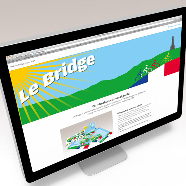 Our proposal was to give window stickers, posters, banners, coasters and flags away to local businesses for free (people are more likely to engage with a cause if they don’t have to pay). Unfortunately, after a lot of hard work by my colleagues here at the Town Hall and myself, we were unable to raise sufficient funding to roll everything out in time for the all important bank holiday weekends of April and May – the perfect opportunity to make visitors to Hebden aware of the TdF. Therefore, apart from an appearance in the recently released ‘Welcome to Hebden Bridge’ tourist guide, Le Bridge is a digital only campaign. A website has been set up where local organisations and individuals can download digital collateral for their own use as well as printable PDFs of the poster templates.